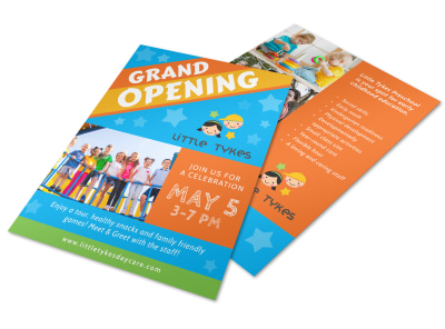 Draw attention to your grand opening with this excellent flyer. Use it to spread the word that a new trustworthy child-care business is in the neighborhood. Include your daycare’s name, address, phone number, and other contact info, and add images of your center and its staff so parents can get peek at what your daycare offers their child.