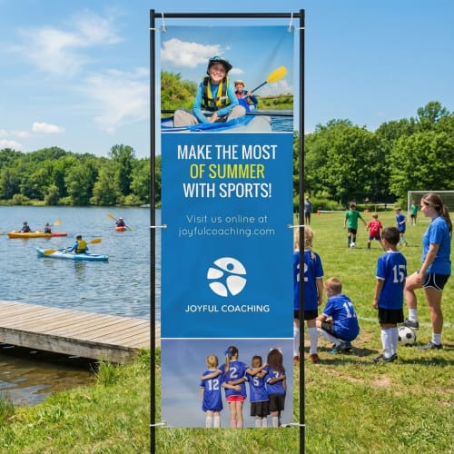 For indoor use, polyester is the most common choice. It has a soft, matte finish that cuts down glare and looks clean under lights, which is why it’s popular for trade shows, lobbies, and retail displays. If the banner needs to go outside, vinyl is the safer pick. It’s waterproof, more rigid, and holds up well in changing weather. And if wind is a concern, mesh is designed to let air pass through so the banner stays put instead of fighting the elements.