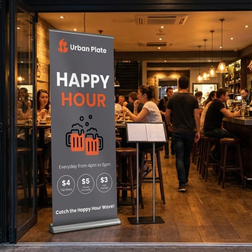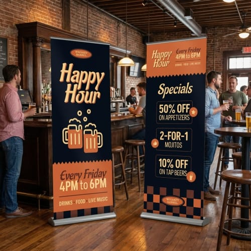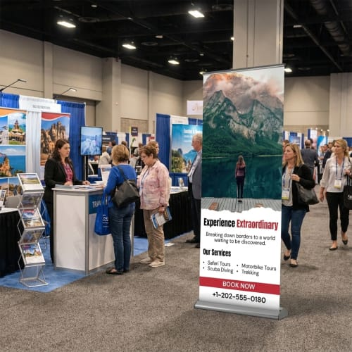 Retractable banners are available in both single-sided and double-sided options. Single-sided banners display your message on one side, which works well when the banner is placed against a wall or backdrop. Double-sided banners feature graphics on both sides, making them ideal for open areas, walk-by traffic, and spaces where people approach from multiple directions. You can choose the option that best fits your layout and visibility needs when ordering.