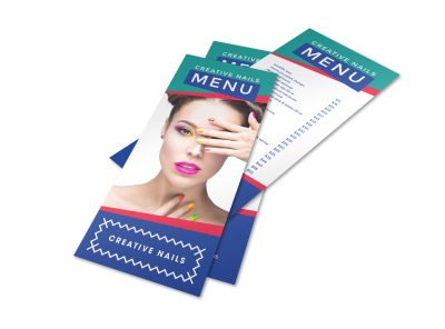 Let clients know what different types of manicures and pedicures are offered at your salon with a menu displaying styles, types, and rates. Announce whether gel or paraffin manicures are on the menu, along with the different styles of acrylic nails you offer. Start designing your nail salon menu today.