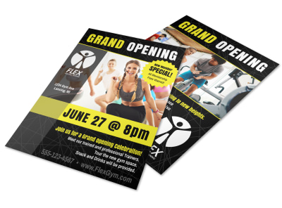Announce the grand opening of your new gym with an exciting flyer personalized with our user-friendly online editor. Include images of the inside of your establishment, including pictures of the different exercise equipment available, and personalize your text, colors, and other design elements to best represent your business. Stir up excitement for your neighborhood gym today.