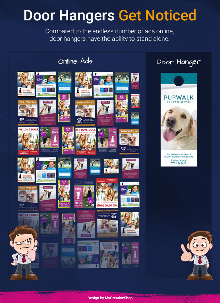 While direct mail marketing can be profitable, door hanger campaigns can also be beneficial in their own way and can offer some advantages over the direct mail route. Sending a postcard might be an easier option; however, it will also be competing with all of the other advertisements in the receiver s mailbox. Door hangers are a unique way to capture someone s attention. When you re walking into your house and there s a door hanger on your doorknob, you can t ignore it, and, chances are, it will be the only hanger there. Alerts for missed deliveries and notices from utility companies are also often delivered via door hangers, and so the homeowner most likely will check it out to ensure they re not missing anything important. Another advantage of using door hangers versus direct mail marketing is the savings on supplies, such as envelopes and postage, and they don t require binding or special preparation for distribution. [caption id="attachment_3727" align="alignnone" width="700"]