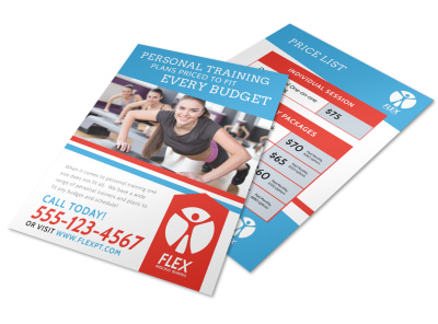 Run down pricing and other valuable information for your personal training service with this custom flyer. Get potential clients pumped by customizing your flyer with your preference of colors, text, images, and more. With our editor by your side, the process of designing your flyer is fast, simple and fun. Let’s get started!