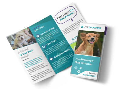 Clipping nails and de-matting fur are your forte, so let pet owners know it with pet grooming tri-fold brochures designed on your own. Use the template of your choice and our editor to create an informative brochure showcasing your services, training, and expertise, then upload before-and-after pictures of your furry clients. Print your brochures from anywhere to get them in the right paws fast.