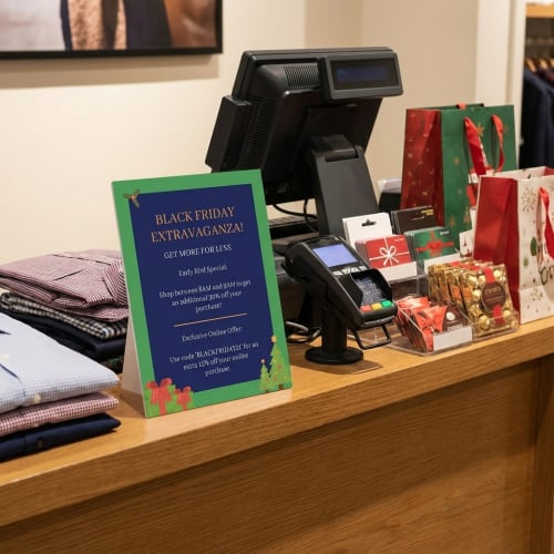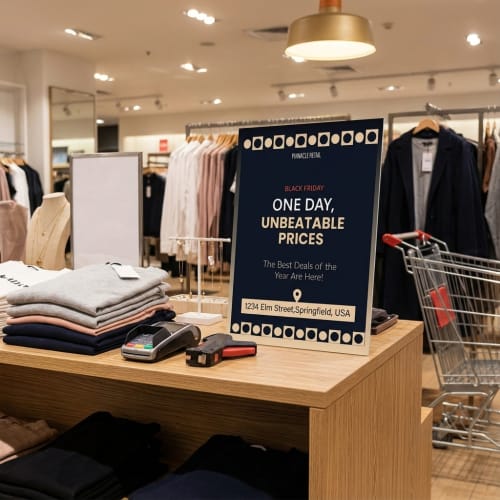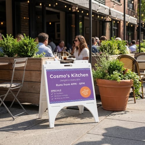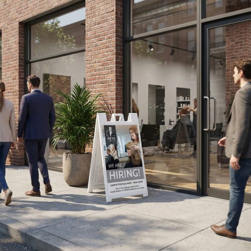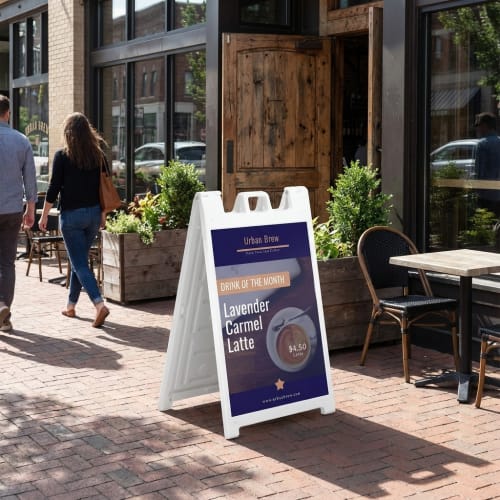 Sign placement depends on your sign type and objective. A-frame signs work well at storefronts, sidewalks, or entryways where they can intercept foot traffic. Foam boards are great for indoor spaces like lobbies and event venues, while counter cards are ideal for point-of-sale areas or reception desks. Choose placements with high visibility and natural sightlines to ensure your message is easily seen.