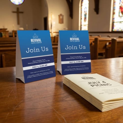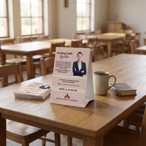 When selecting your custom table tent, consider how the tent will be displayed, handled, and stored. The 4" x 6" size strikes a balance between readability and footprint, making it easy to place on tables, counters, or podiums. Quantities are available for small runs or large-scale distribution, depending on your event or campaign. Durable stocks keep tents upright while minimizing wear, and folding construction allows for convenient stacking and transport. Choose the right quantity and finish based on how often you'll use, move, or refresh the display.