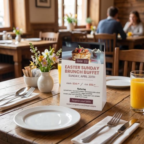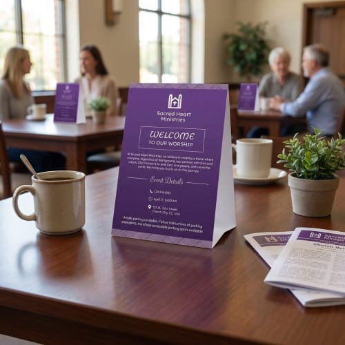 Custom Table Tents are a reliable way to display messaging where it matters most-at eye level and in high-traffic spaces. Ideal for promotions, menus, announcements, or directional signage, each tent is printed double-sided on premium stock for full visibility. Choose from four professional finish options including uncoated, matte, and high-gloss UV to match your brand’s tone and environment. With print quality and turnaround you can count on, Table Tents are a flexible solution for restaurants, events, hotels, and beyond.
